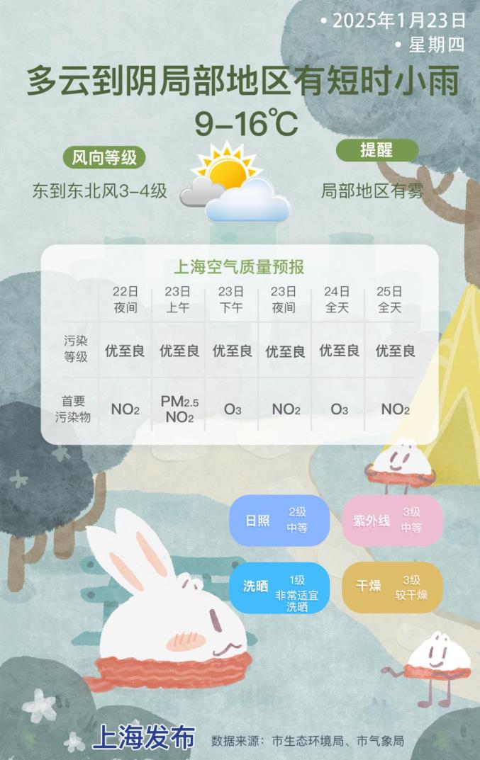 早晨部分地区有雾,全天多云到阴部分地区有短时小雨。东至东北风3-4级。最高气温16℃,最低气温9℃。相对湿度为95%-55%。