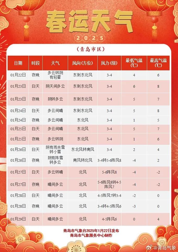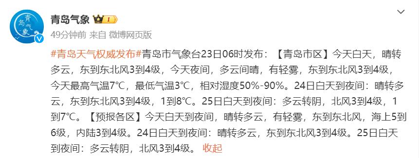 【青岛市】今天白天,天气晴朗多云,东至东北风3至4级。今天晚上,多云中有晴天,有轻雾。东至东北风3至4级。今天最高温度为7℃,最低温度为3℃,相对湿度为50%-90%。24日白天到晚上:天气晴朗多云,东至东北风3至4级,1至8℃。25日白天到晚上:多云转阴,北风3至4级,1至7℃。