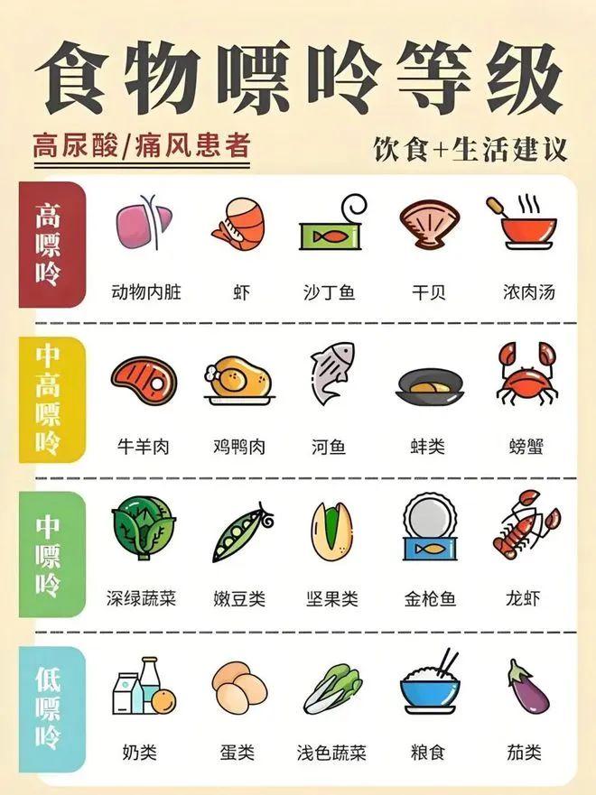 嘌呤在体内代谢后会产生尿酸,因此要避免食用动物内脏、海鲜(沙丁鱼、虾、蟹等)等高嘌呤食物。、肉汤等。