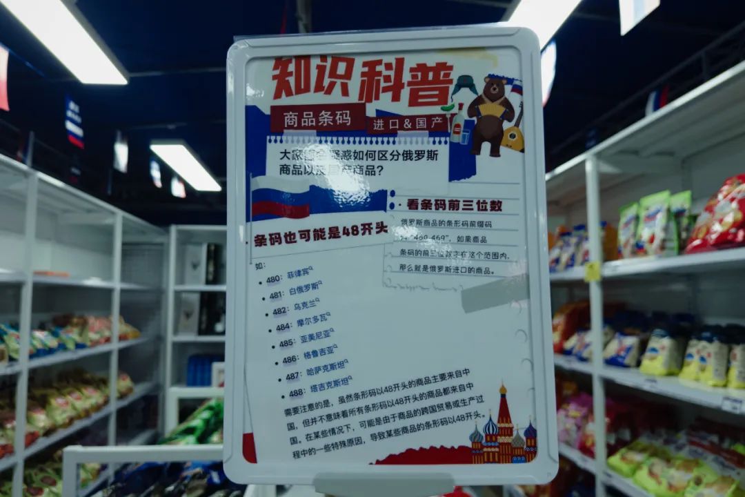 在商店的一面墙上,俄罗斯产品的照片在电视屏幕上滚动,这些照片也出现在俄罗斯一家电视台的采访图片中。但是从招牌拆除的那一刻起,电视就不再打开了,“俄罗斯RU进口产品馆”的名字也被抹去了,随之而来的是“进口零食产品”。