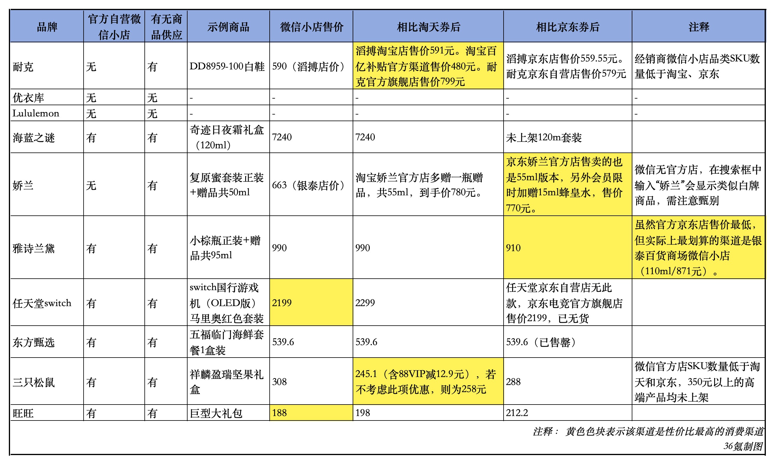 上图标注了黄色色块的渠道,代表了购买该产品最划算的方式。十个例子中,微信店只有两个有货源或价格优势。以上十个品牌中,有一半没有官方微信店,或者店铺SKU数量远低于淘天和JD.COM旗舰店。