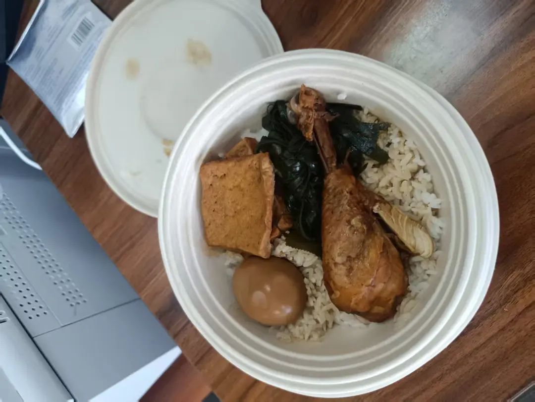 购买了一份价格为14.9元的鸡腿饭,造型上看,这种鸡腿饭和沙县小吃几乎没有什么不同, 鸡腿,卤蛋,豆干,酱汁四种搭配。配菜稀缺,重量适中。