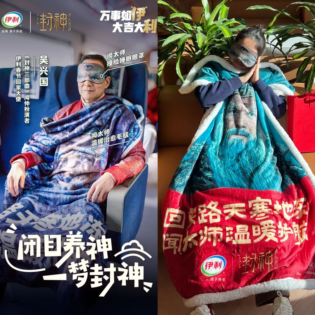 伊利X封神X吴兴国联合打造了春节旅游高峰必备神器,如行李套、毯子、电脑包、睡眠眼罩等。,并将顺利回家的好运传递给众多网友,并在社交媒体上发起有奖互动。第一批获得周边客户的照片,多平台自来水强势种草,相关话题登上自然热搜,再次提升了“春节选择伊利”的人气。大量年轻网友自发参与,进一步流行“春节选择伊利”的概念。