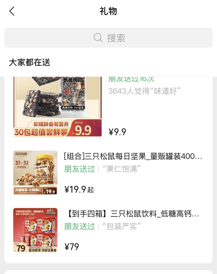 比如根据交友为界面新闻提供的统计数据,目前用户在交友微信账号时使用送礼功能的高频商品类别包括食品零食、服装(新年儿童年衣、妈妈服)等。与此同时,来自官方商店的茶叶“送礼”订单明显增加。根据东方选择披露的数据,目前自营产品总数超过500种,其中刺梨汁、樱桃、草莓等直营产品是送礼物较多的产品。