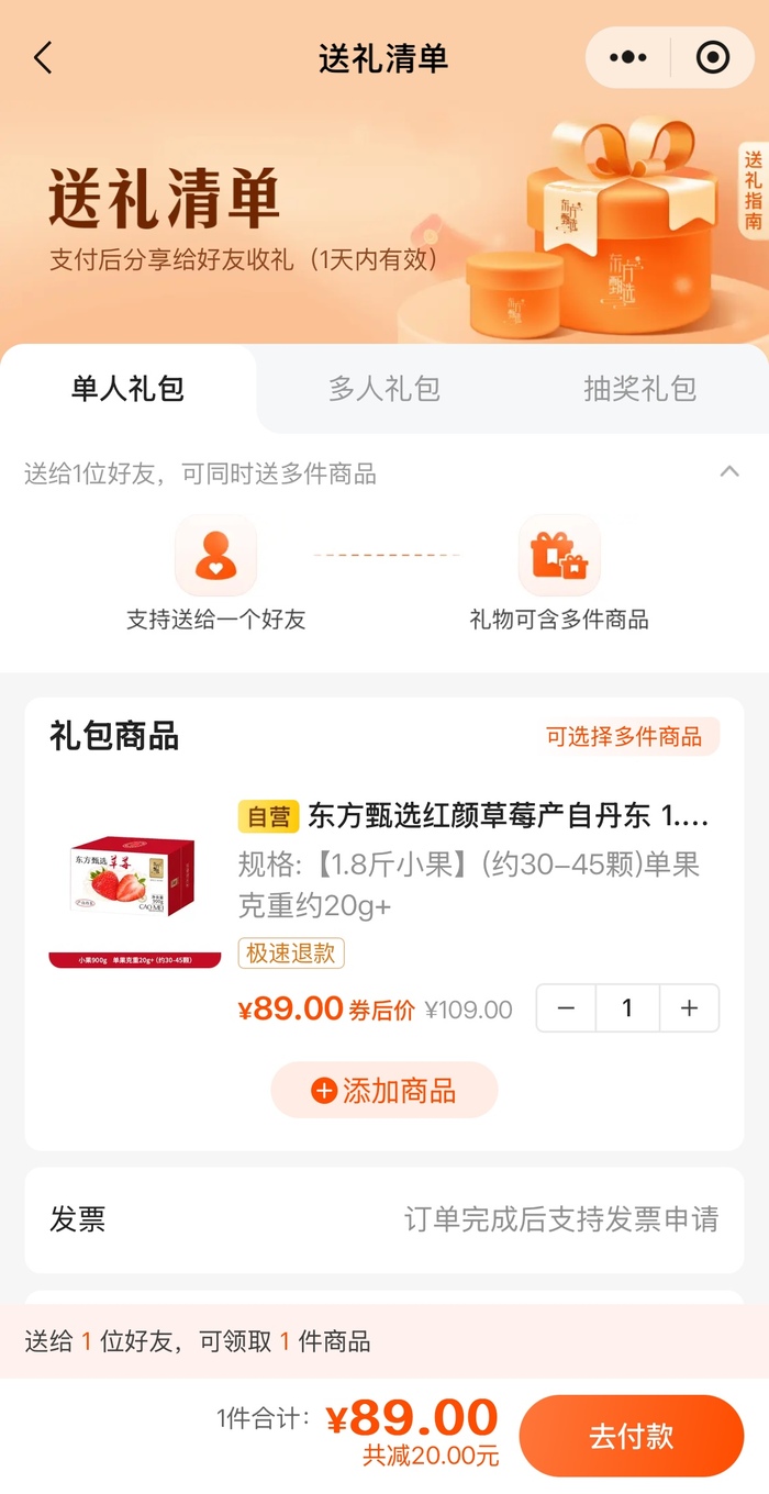 东方选择微信小程序“送礼”功能页面