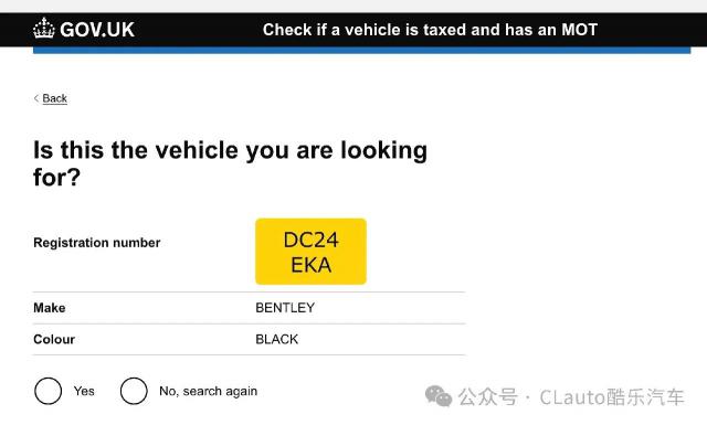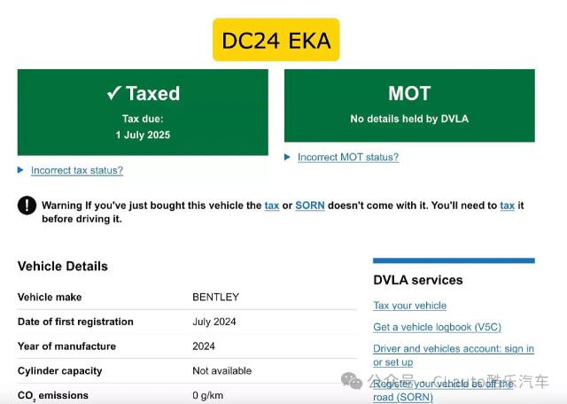 而且有媒体在英国车辆执照管理局网站上将该车的车牌“ DC24EKA "输入并查询,发现这辆黑色汽车是为了 2024 年 7 每月第一次登记,制造商就是宾利。资料表中还列出了二氧化碳排放量。 0 克 / 公里,基本上可以肯定这是宾利的纯电动车型。