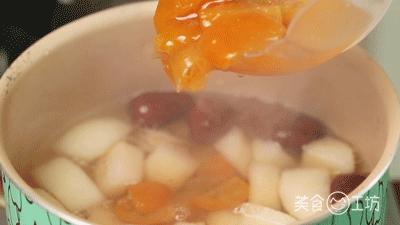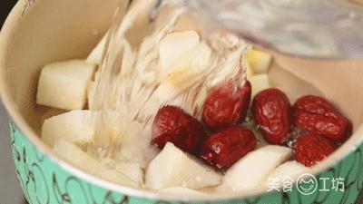 2. 红枣、雪梨、冰糖一起放入锅中,加入适量清水,大火煮开,转小火煮开。 15 分钟。(若使用新鲜金桔,此步骤可将金桔直接放入煮沸中)