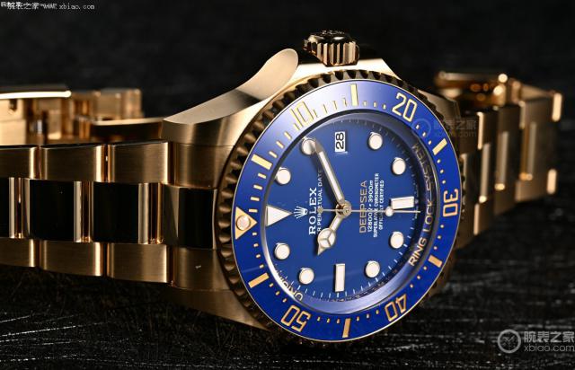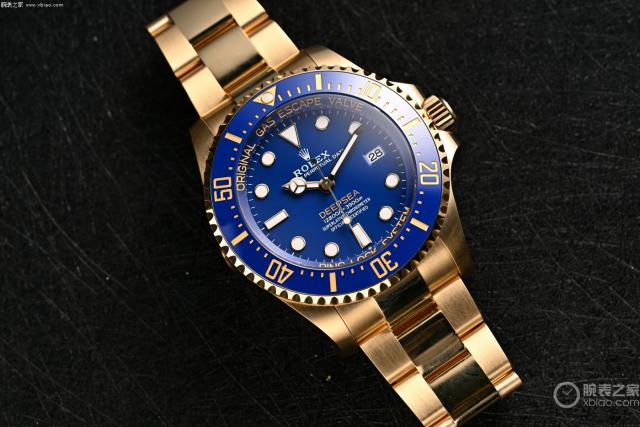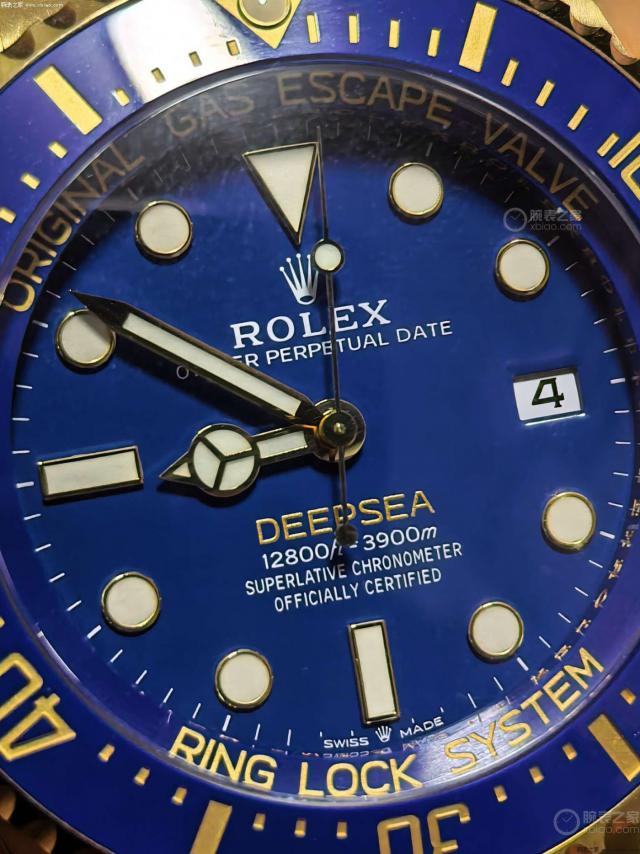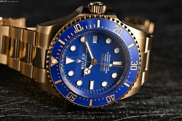蓝漆表盘,也与蓝陶瓷表圈相辅相成。另外,表盘上的“DEEPSEA“字呈粉黄色,也与整体色调形成鲜明对比,容易识别。表盘上的时标和指针都填充了夜光材料,可以在黑暗中长时间发出蓝光,提高了夜间阅读的清晰度。