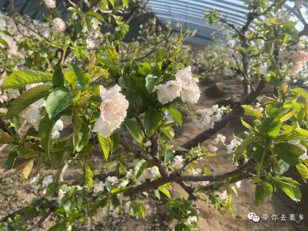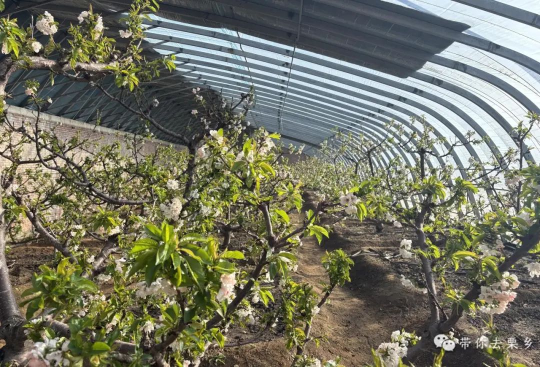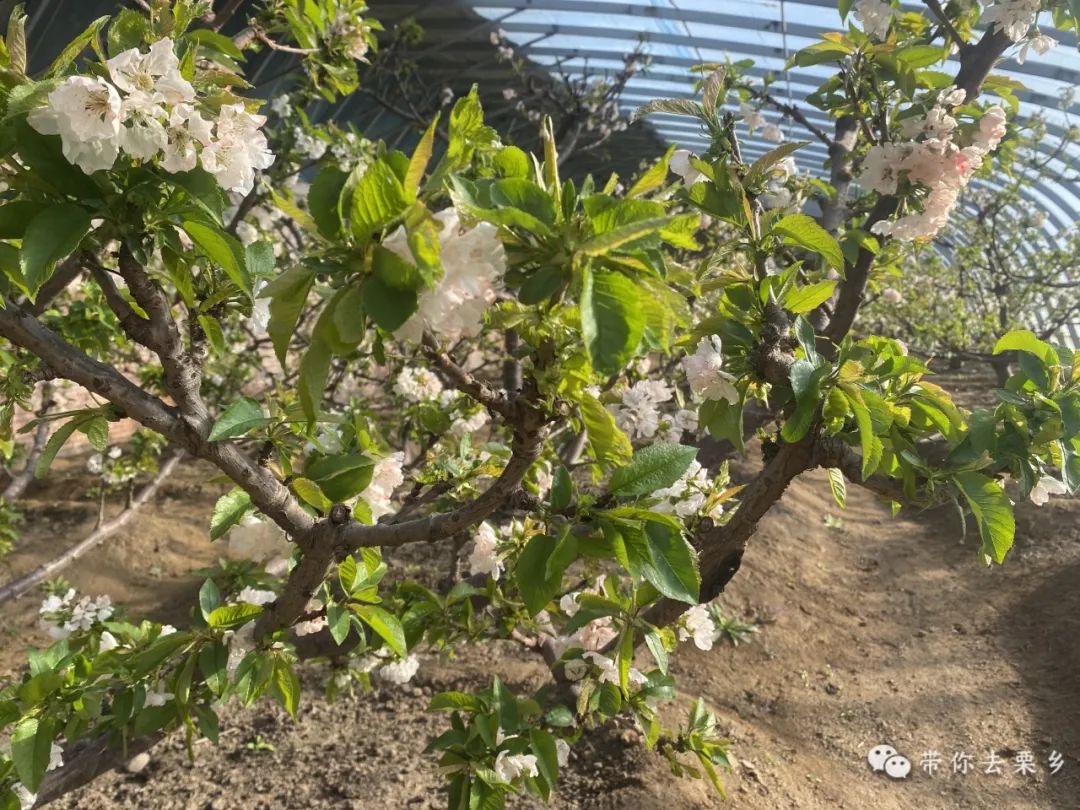 走进樱桃温室,一股温暖湿润的气息扑面而来,与外界的寒冷形成鲜明对比。樱桃树排列整齐,满枝的樱桃花瞬间映入眼帘。在绿叶的映衬下,樱桃花优雅、干净、清新、优雅,宛如一片梦幻般的花海。