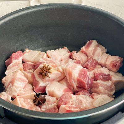 1、猪肉五花肉切成大概 3-4 一个厘米见方的块,和八角一起放入锅中
