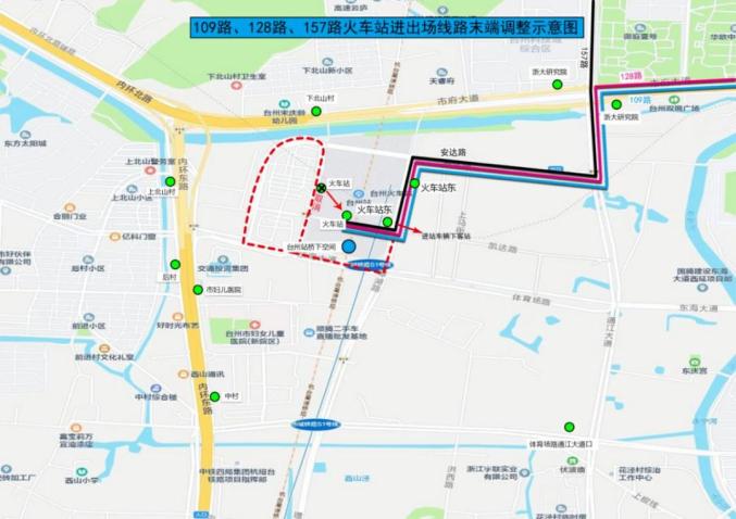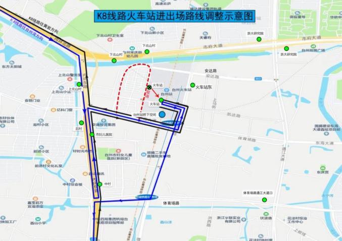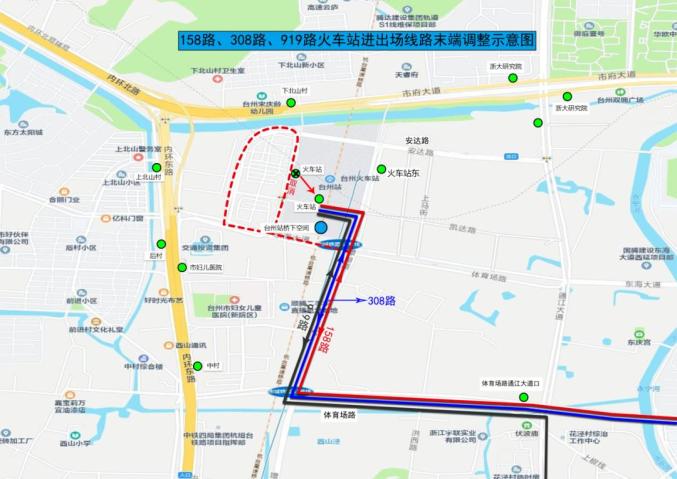 通江大道经安达路、景湖路调整后,进入台州火车站公交枢纽站新站,同时增加火车站东双向停靠站。