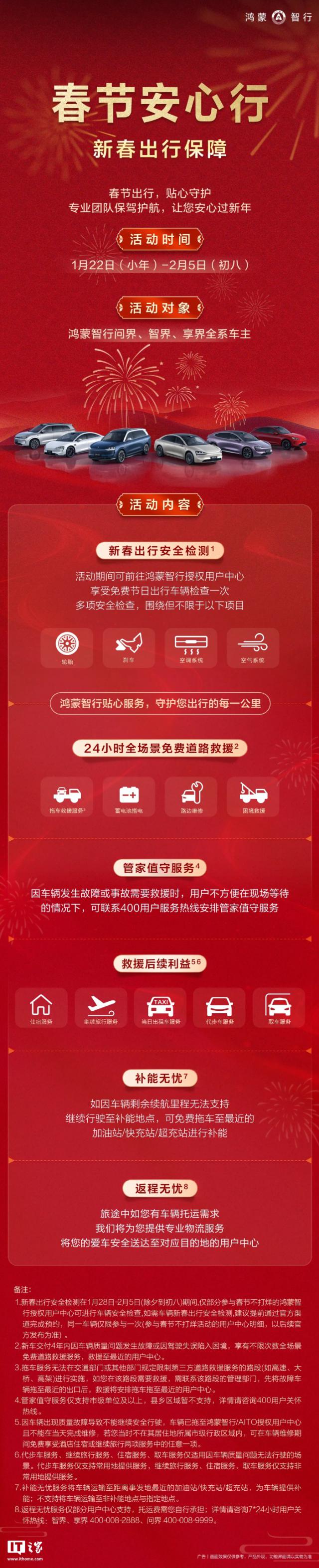 IT 世家 1 月 23 昨天,鸿蒙智行宣布推出“春节出行保障”服务,活动时间为活动时间。 1 月 22 日(小年)-2 月 5 日(八),活动对象为鸿蒙智行问界、智界、享界全系车主。