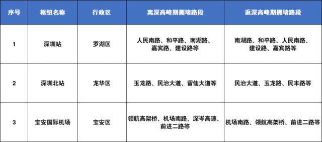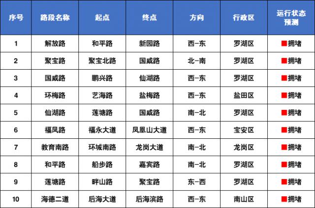 预计春节假期期间,罗湖区解放路、聚宝路、国威路、仙湖路、和平路、莲塘路、盐田区环梅路、宝安区福凤路、龙岗区教育南路、南山区海德路等部分路段交通运行压力明显。