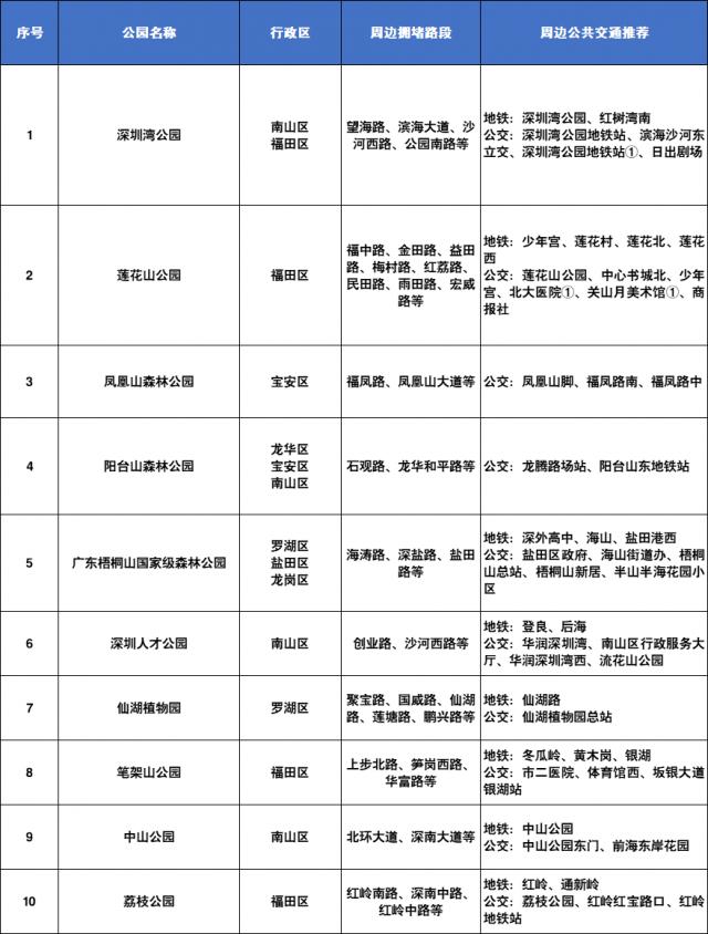 深圳湾公园、莲花山公园、凤凰山森林公园、阳台山森林公园、广东梧桐山国家森林公园、深圳人才公园、仙湖植物园、笔架山公园、中山公园、荔枝公园等。
