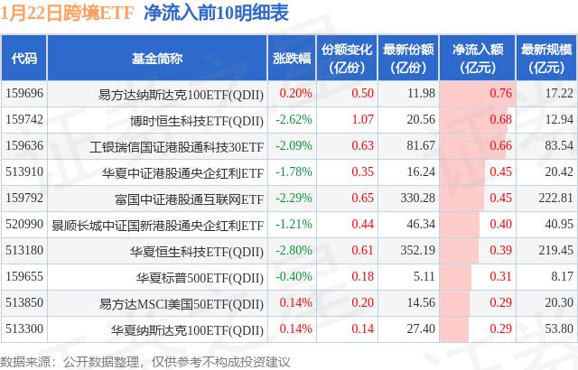 一月二十二日跨境ETF净流出3.88亿元
