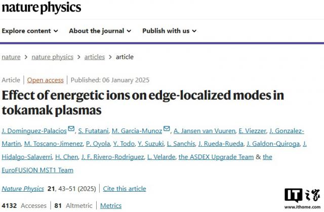 该项目的研究人员说,SMART 可以为今后的紧凑型聚变反应堆提供优异的聚变性能和功率处理。SMART 托卡马克等离子体是设备首次成功生成的,相关研究成果已经在 2025 年 1 月 6 在新一期《核聚变》杂志上发表的日本杂志(IT 世家附 DOI:10.1038/s41567-024-02715-6)。