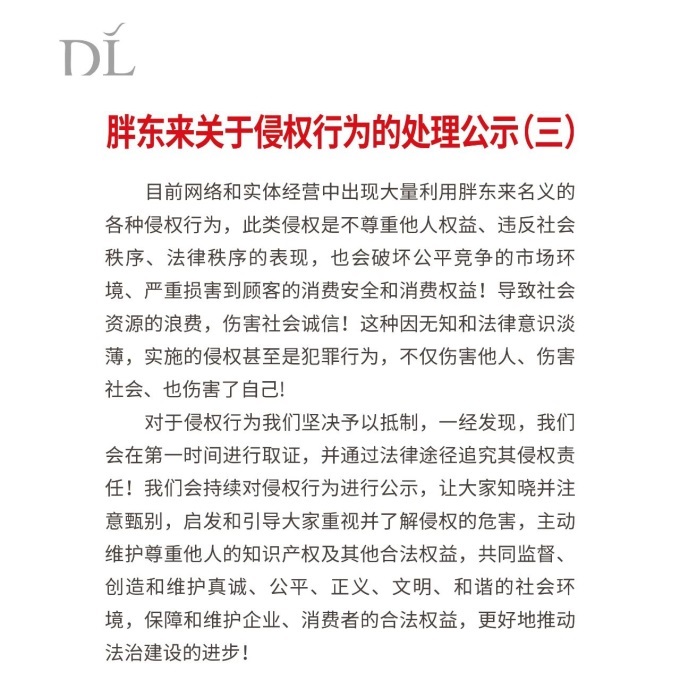 胖东来在宣传中表示,目前,以胖东来为名的各种侵权行为在网络和实体管理中得到了广泛应用。这种侵权行为不尊重他人权益,违反公共秩序和法律秩序,也会破坏公平竞争的市场环境,严重影响客户的消费安全和消费者权益。