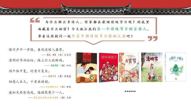 儿童,我们中华文明有着悠久的历史和许多节日。古代人用简单的诗歌来描绘传统的节日故事,给人无限的想象空间。同时,我们还阅读了许多传统的节日故事绘本,现代作家用图文结合的方式来描述节日故事,既有故事感又有代入感。为何这么多诗人、作家都在赞美传统节日?里面到底藏着什么秘密?现在就让我们做一个传统节日的宣传者,带着这些疑问一起开始中国传统节日探秘之旅吧!