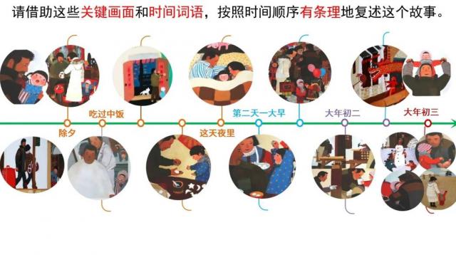 话题 1:孩子们,通过时间线,你们发现了这本绘本隐藏的传统节日秘密吗?这个故事里有哪些关于除夕和春节的习俗?有些习俗只画图片,没有文字。是什么?