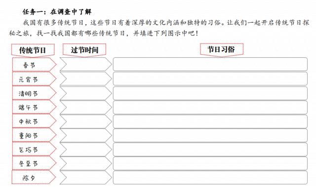 (1)交流节日故事:除了除夕和春节,其他传统节日的习俗也让我们离家人越来越近。你有类似的经历吗?课前请收集传统节日的时间和习俗。现在请学生以学习小组为单位,先交流一下彼此感兴趣的传统节日故事。