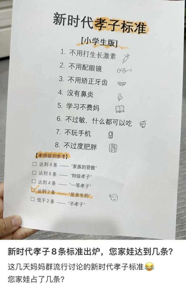 没有眼镜,没有矫正牙齿,没有生长激素,没有手机,没有过敏。 ... 孩子们满足的条数越多,孝顺程度就越高。