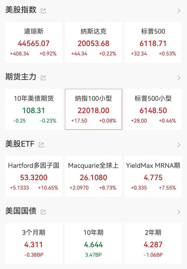 道琼斯工业指数上涨 408.34 点,至 44,565.07 点,涨幅 0.92%;纳斯达克综合指数上涨 0.22%,至 20,053.68 点。周四,三大股指连续第四个交易日上涨。