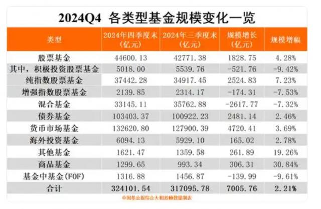 公开发行基金方面,截至 2024 年底,公募基金总规模达到 32.41 一万亿元,其中股票基金 4.46 万亿,占比 如果增加13.76%, 1pct 配置股票,对应 3000 增量资金约1亿元。