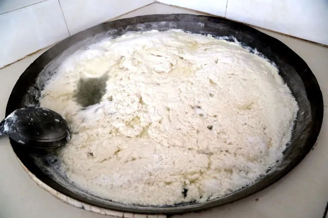 用漏勺把煮好的豆花从锅里捞出来