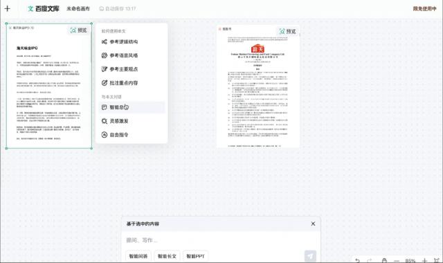 我们和 AI 交互技术,因为一个广阔的画板有很大的不同:可以完成输入材料, AI 对话,生成内容的全过程,并一次对多个文档发出指令,让自由画板同步“多线程”处理。