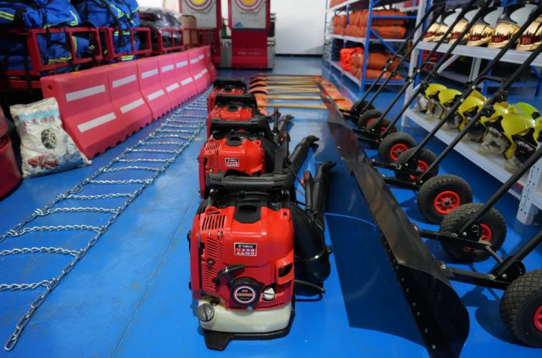 盘点应急物资,储存30多吨融雪剂、扫帚、吹雪机、防滑链等120多件物品,确保除雪物资和工具完好备用,满足应急物资需求。