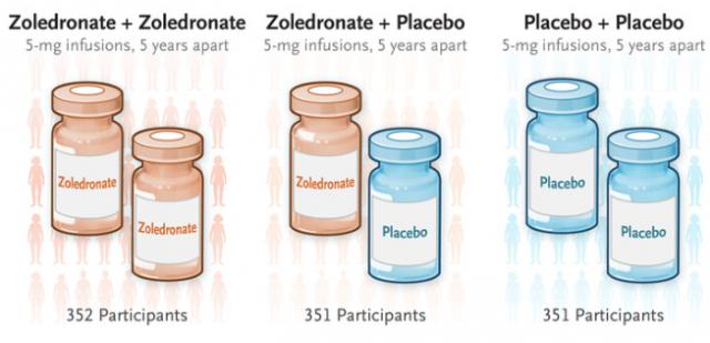 这项研究是一项历时 10 2008年前瞻性、双盲、随机性、安慰剂对照试验,涉及 50 至 60 绝经后初期,这些妇女在腰椎、股骨颈部或髋骨中有骨矿物密度。 T 评分在 -2.5 分 ~0 分区(一般) T 评分≥ -1 表示正常骨矿物密度)。参与者被按照 1:1:1 随机分配比例分为三组,各接受下列治疗:在基线时和第一组。 5 年给予 5 唑来膦酸滴注剂量mg(唑来膦酸) - 唑来膦酸组);基线时给予 5 用mg剂量的唑来膦酸滴注 5 每年给予安慰剂(唑来膦酸 - 安慰剂组),或在基线和第一线。 5 每年平均给予安慰剂(安慰剂) - 安慰剂组)。