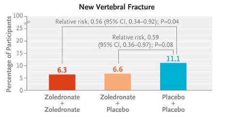 与安慰剂 - 与安慰剂相比,唑来膦酸 - 脆性骨折、任何类型的骨折和主要骨质疏松性骨折的相对风险是唑来膦酸组的参与者。 0.72(95% CI,0.55 至 0.93)、0.70(95% CI,0.56 至 0.88)和 0.60(95% CI,0.42 至 0.86),而唑来膦酸 - 上述安慰剂组参与者的相对风险分别是 0.79(95% CI,0.61 至 1.02)、0.77(95% CI,0.62 至 0.97)和 0.71(95% CI,0.51 至 0.99)。