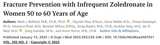 [ 1 ] Mark J. Bolland, M.B., Ch.B., Ph.D.et al.Fracture Prevention with Infrequent Zoledronate in Women 50 to 60 Years of Age.January 15, 2025N Engl J Med 2025;392:239-248 DOI: 10.1056/NEJMoa2407010