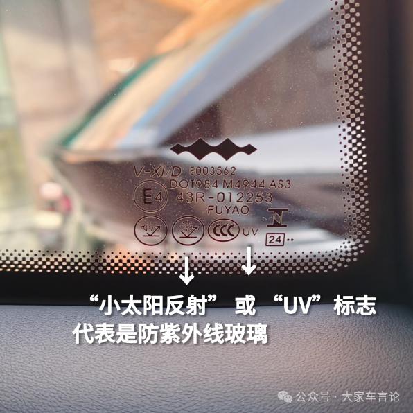 可以先看看玻璃上角的字标,如果有“小太阳反射”的标志,或“”UV"字眼,表示这是一种防UV玻璃。例如:方程豹8,整车都有"UV"字样防晒玻璃。