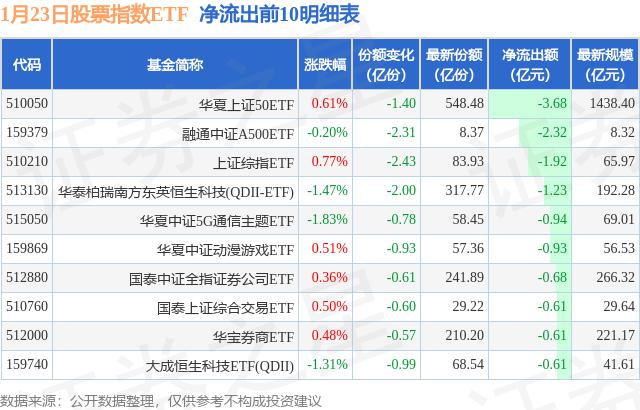 当天有 220 只股票指数 ETF 资金净流出的基金,其中华夏上交所净流出排名第一。 50ETF(510050)减少了份额 1.4 一亿份,净流出额为 3.68 亿元。