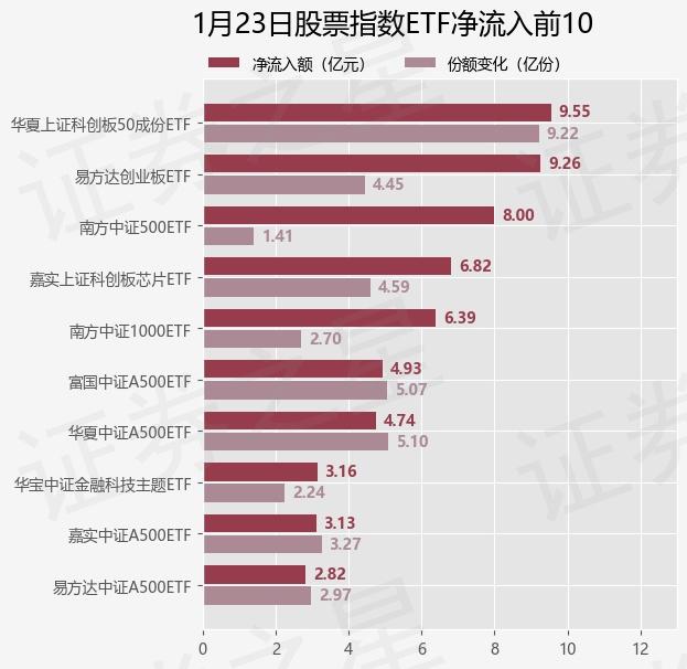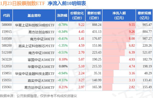 当天有 300 只股票指数 ETF 资金净流入出现在基金中,其中华夏上证科技创新板排名第一。 50 成分 ETF(588000),份额增加 9.22 十亿份,净流入额为 9.55 亿元。