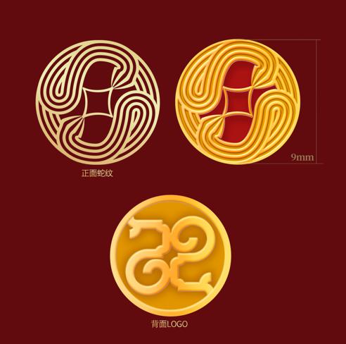 金色的一面是双蛇信件的巧妙组成古代硬币图案,一面是蛇年 logo,象征着新的一年平安和谐,吉祥富足。
