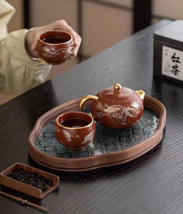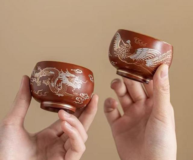 一壶二杯配紫砂杯,为龙凤对杯,非常适合送给爱茶的人,或者夫妻二人同品茶。