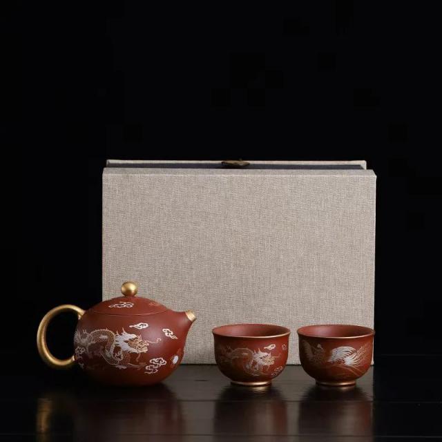 这套是中国著名瓷器艺术家。 --- 徐志成监制的【朱泥镀金龙凤呈祥紫砂西施壶凤鸣壶茶套组】