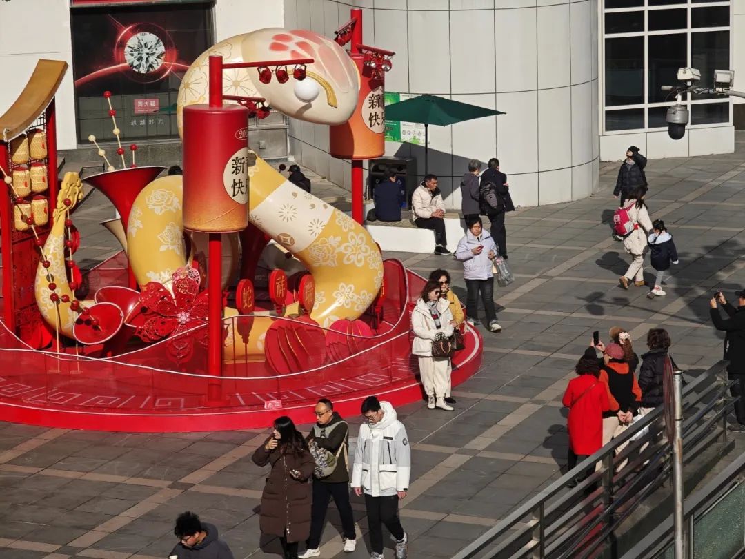 主题造景的主体是一个巨大的圆形设备,中心是显眼的红色“福”字,周围是灵动的蛇形装饰,蜿蜒盘旋,仿佛在跳舞,意味着新的一年会顺利进行。周围是大红牡丹,意味着鲜花盛开。有了传统的红灯笼和周围五颜六色的花卉和绿色植物,整体布局不仅展现了蛇年的独特魅力,还传达了新年的喜悦和活力,吸引了许多游客拍照。