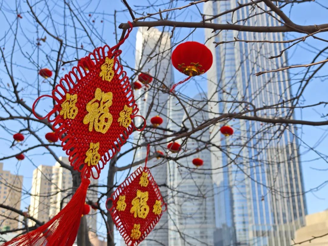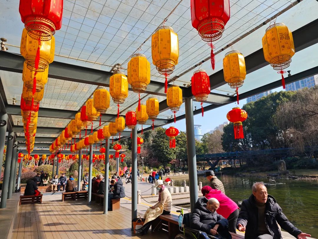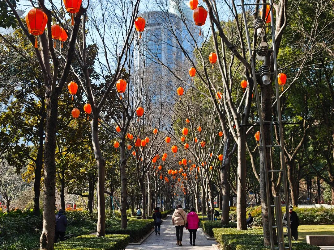 此外,在元旦氛围布局的基础上,公园进一步突出了传统的春节节日,精心定制了各种风格的国风灯笼,或单独或交错悬挂在树枝和灯杆上,色彩温暖显眼,为公园增添了一抹美丽温暖的色彩。围栏和灯杆用精致的中国结装饰,造型优雅,意味着万事如意,团结幸福,与红灯笼相映成趣,向每一位游客传递着浓浓的年味。