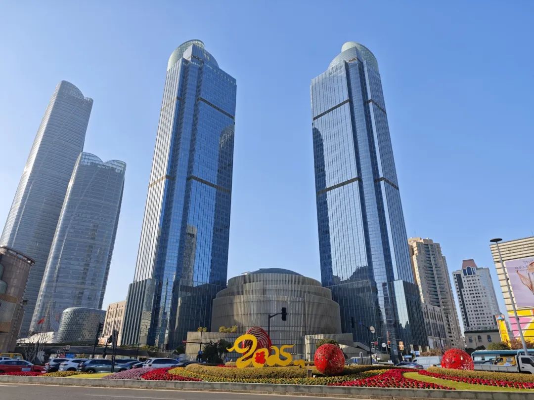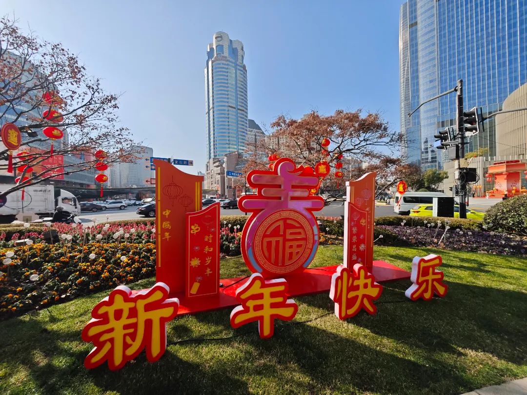 走在徐家汇的街道上,到处都是红灯笼,大中国结,金色的“2025”logo。今年,徐汇区蛇年景观小品从过去的文化中汲取灵感,以相对抽象的方式表达属相“蛇”元素,制定了“2025”主题标志,名为“画蛇添福”,布置在多种绿化中。同时,根据不同的风景,加入灯笼、中国结、福字等不同材质和大小的传统新年装饰,融入简约风格、民族风格等现代审美潮流,营造出既传统又现代的视觉效果,用logo连接徐汇区绿地的年味。