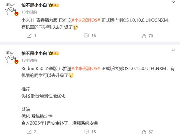 小米多款手机推送澎湃OS正式版内测 有没有你的型号?