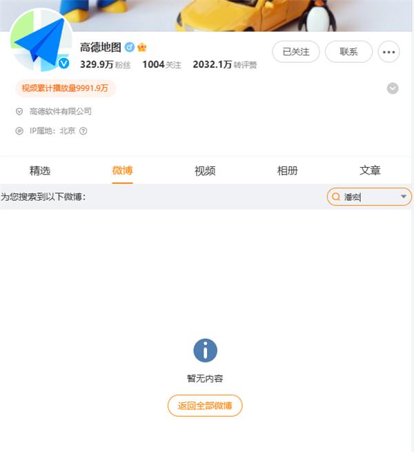 目前,这篇博文已经不再显示在高德地图微博的主页上。但是,在高德地图的官方视频号中,去年还是可以看到的。 11 月 17 潘宏语音包相关视频日发布。