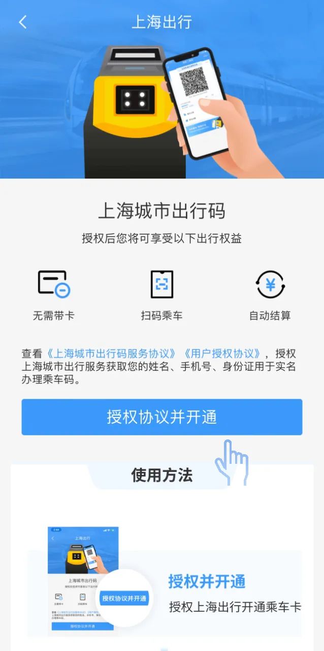 3、跳转到授权页面,授权上海出行开通乘车卡,完成签约。