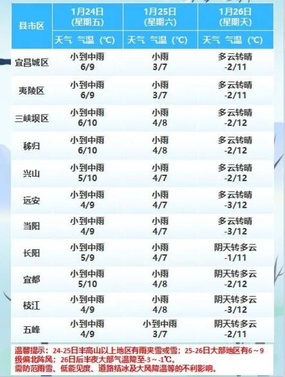 受强冷空气影响,1月24日至1月26日,全省将有大风大雪,鄂西北山区雨夹雪或雪区将扩大至西部和北部;北部阵风6至9级,平均气温降低5℃。~11℃,最低温度降至-1℃以下。