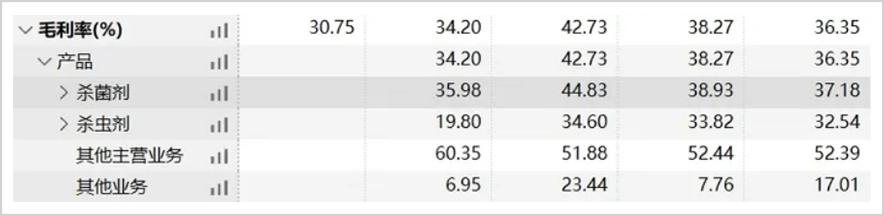 从2022年到2024年的前三个季度,美邦股权销售的毛利率从上市第二年开始分别为42.73%。、两年内,34.2%和30.75%下降12%。%。在这两种主要产品中,2023年杀菌剂的毛利率仍然可以保持在35%左右,而杀虫剂已经下降了20%。