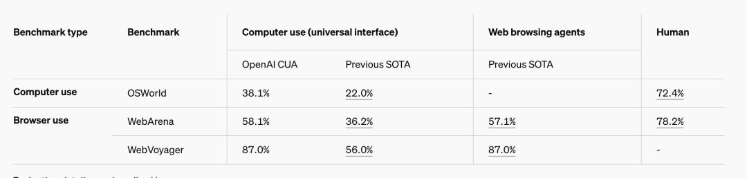 与此同时,OpenAI提到, 虽然CUA还处于起步阶段,并且有局限性,但是它设定了一个新的最先进的标准结果,在OSWorld上实现了38.1%的全计算机使用任务通过率,在WebArena上实现了58.1%。 87%的WebVoyager。