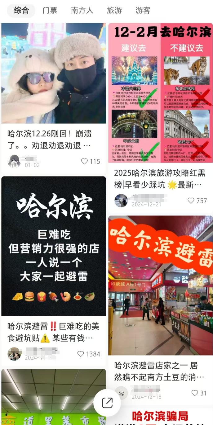 在社交媒体上,与“哈尔滨防雷”相关的笔记总能吸引大量的讨论和观看。“小土豆”抱怨自己的“踩雷”经历,而当地人则努力反击,坚决“维权”。曾经幸福的“南北家庭”,逐渐演变为地域黑暗和“南北大战”,批评混乱。