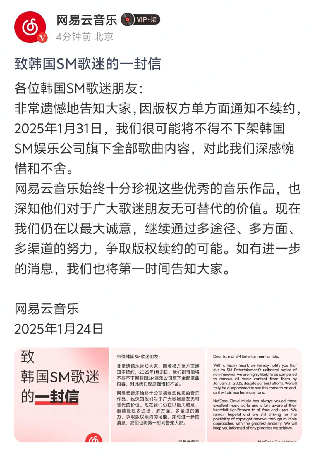 1月24日,网易云音乐发布了《致韩国SM粉丝的一封信》,称网易云音乐很可能要于1月31日下架韩国SM娱乐公司的所有歌曲内容,因为版权方单方面通知不续签。#网易云或SM旗下所有歌曲下架#话题迅速登上微博热搜,引发多个平台热议。